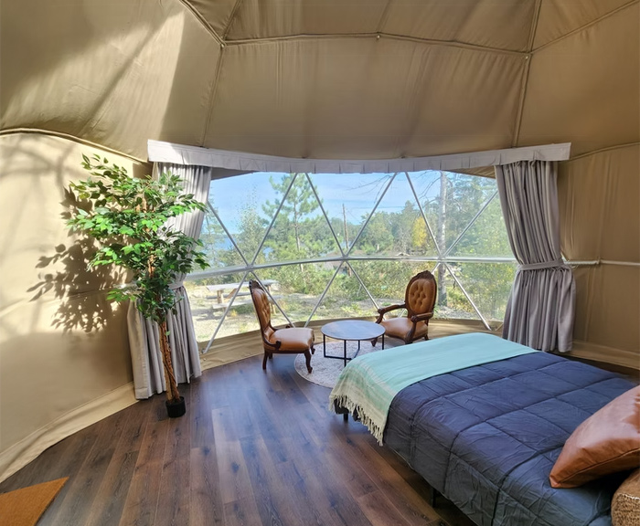 Big Pine Lake Glamping is a family-operated resort nestled in Northwestern Ontario amidst the stunning beauty of the Canadian Shield, overlooking the picturesque Big Pine Lake. Located on over 22 acres of forest, with hiking trails, our accommodations include a Stargazing Dome, two Deluxe Log Cabins and two Prospector Tents. We also offer over 400 feet of shoreline with a private boat launch and several private docks.